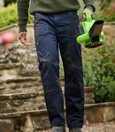 65% polyester/35% cotton. Water repellent finish. Part elasticated waistband with belt loops. Zip fly with button over. Two side patch pockets and two zip pockets with slanted entry. Rear pockets. Small coin pocket. Right leg zip pocket. Knee pad pockets. Reinforced crotch seam. Triple needle stitching. Cut out label.